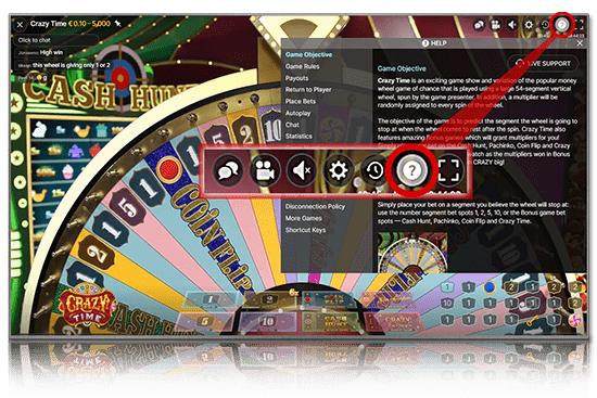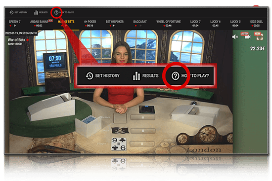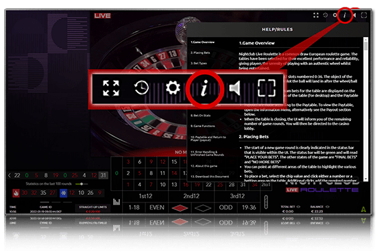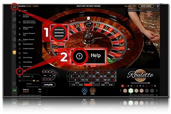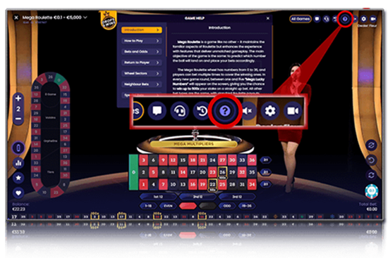 Aby zapoznać się z zasadami każdej z gier, kliknij ikonę pomocy podczas gry. Zerknij na poniższe zrzuty ekranu, aby zobaczyć, gdzie znaleźć ikonę pomocy w zależności od danego kasyna na żywo.